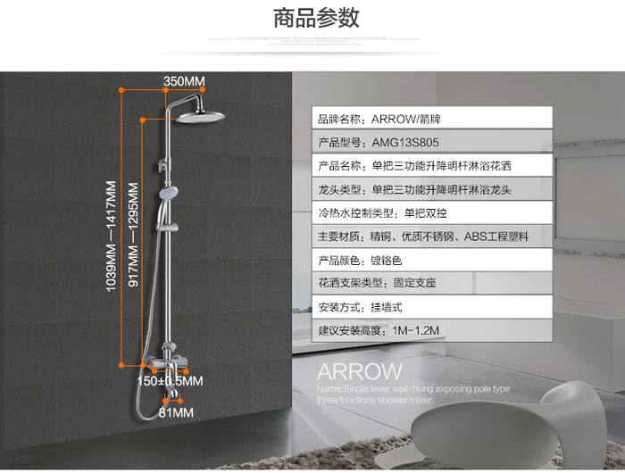 ARROW箭牌卫浴 单把挂墙明杆花洒AMG13S806